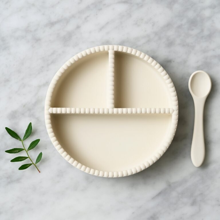 Silikoninė trijų skyrių lėkštė su šaukšteliu, Cream