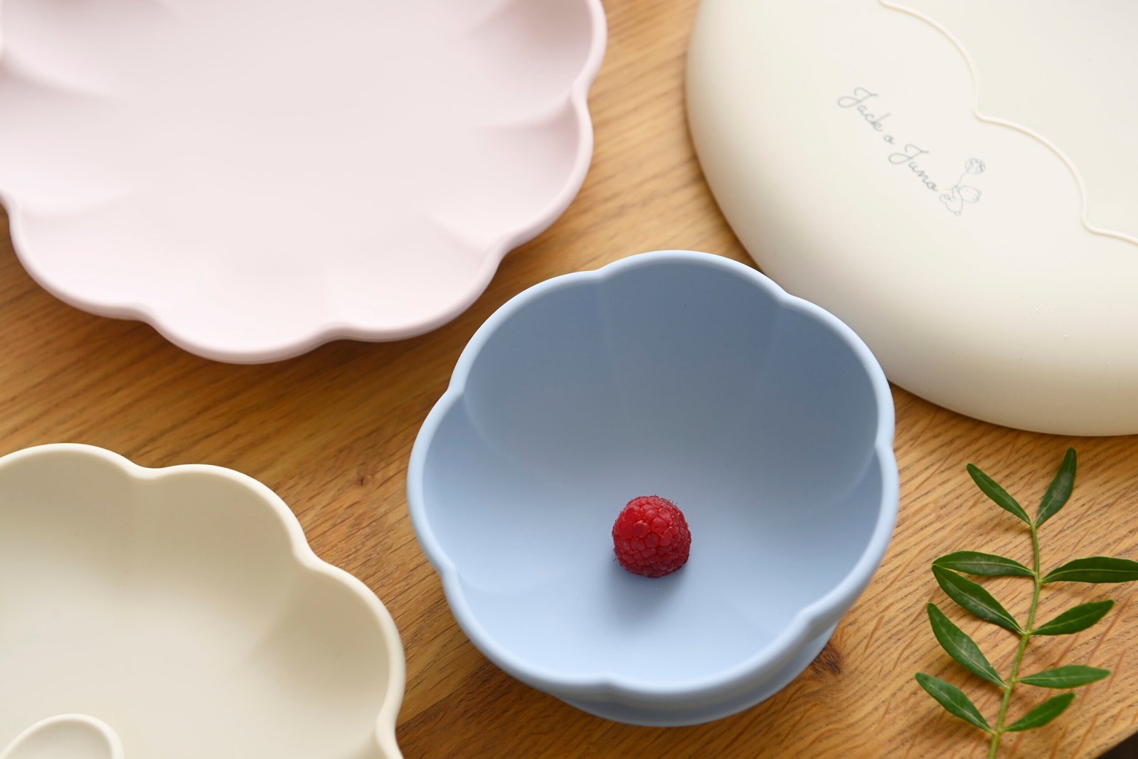 Švediško dizaino, gėlės formos valgomojo komplektas, kurį sudaro lėkštė, dubenėlis, puodelis su šiaudeliu ir šaukštas. Silikoninė lėkštė ir dubuo turi prilimpantį pagrindą, kuris išlaiko indus vietoje. Silikoninio šaukštelio rankena yra trumpesnė, pritaikyta specialiai prie vaiko rankų. Silikoninis nedūžtantis puodelis su šiaudeliui ypač patogus mokantis savarankiškai gerti. Maistinis silikonas leidžia saugiai pašildyti maistą, indus galima plauti indaplovėje, nors dažniausiai užteks karšto vandens ir greito nuvalymo, kad indai atrodytų kaip nauji. Išskirtinio dizaino dėka Jūsų mažylio pusryčiai, pietūs, vakarienė bus ne tik skanūs, bet ir įdomūs bei žaismingi!